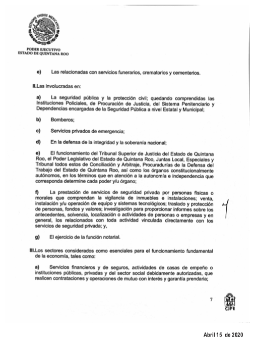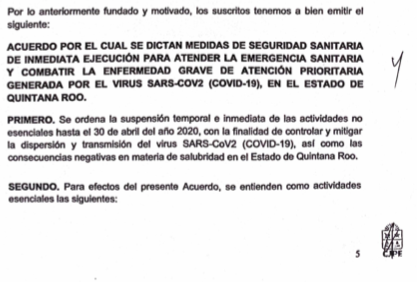 En atención al “Acuerdo por el cual se dictan las medidas de seguridad sanitaria de inmediata ejecución y las requeridas para la prevención y el control de la enfermedad por coronavirus (covid-19) en el estado de Quintana Roo” se les informa a nuestros clientes que dentro de las actividades esenciales se encuentra la función notarial.